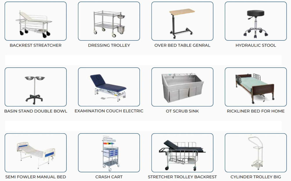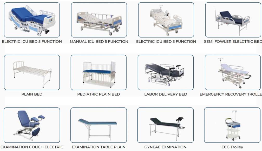 • Hospital Beds – Manual, semi-electric, and fully electric beds for all patient care needs.